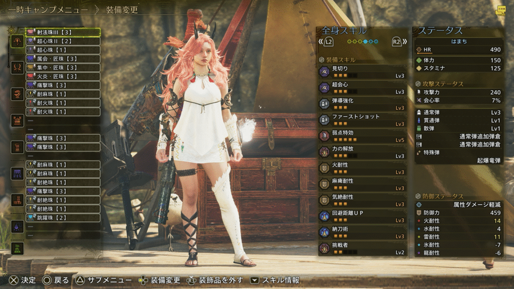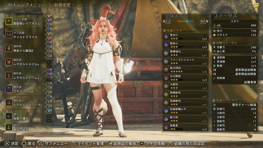 装備紹介動画も投稿する予定ですが、装備はこんな感じです。通常弾ライトを使用するのは第2フェーズ以降なので、第1フェーズは雷ライトボウガン2つ(ラギアライト&レダウライト)持ちで行っています。