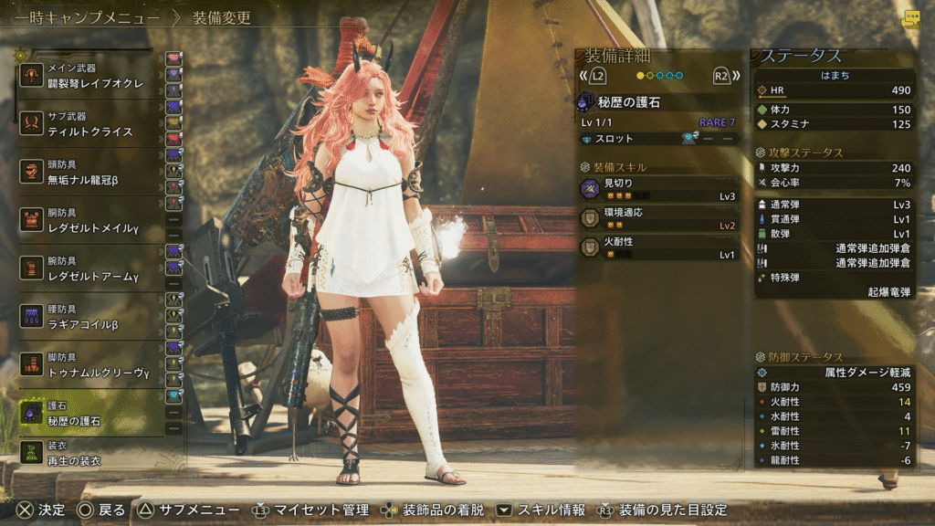 今回の装備を組むにあたり、かなり都合の良い護石を持っていました。理論値かどうかは調べていませんが、環境適応も火耐性も欲しいスキルだったので採用しました。