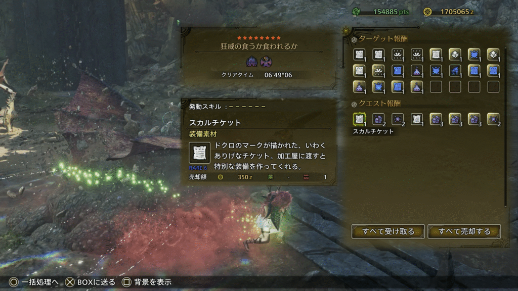 クエストクリアでスカルチケットが入手できます。頭防具生産に3枚必要となります。