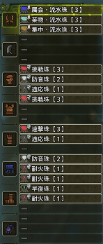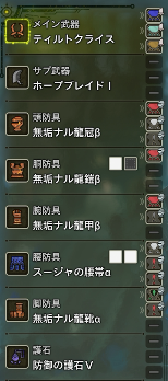 無垢4部位+スージャ腰で生存特化型となっています。環境適応Lv2を積むことで、スリップダメージを無効化します。私の場合は快適性重視で耳栓を積んでいます。