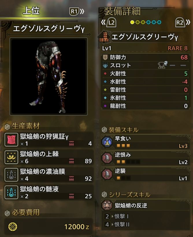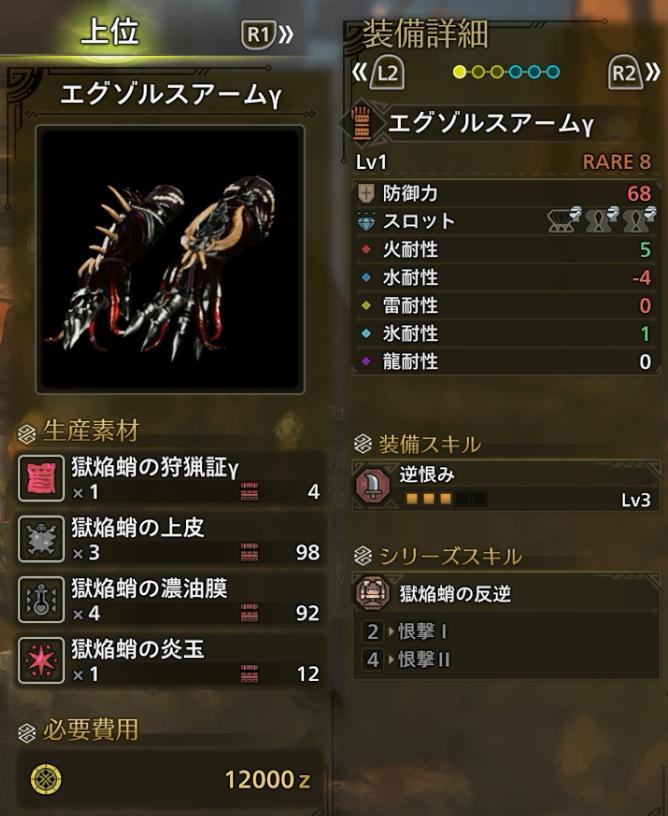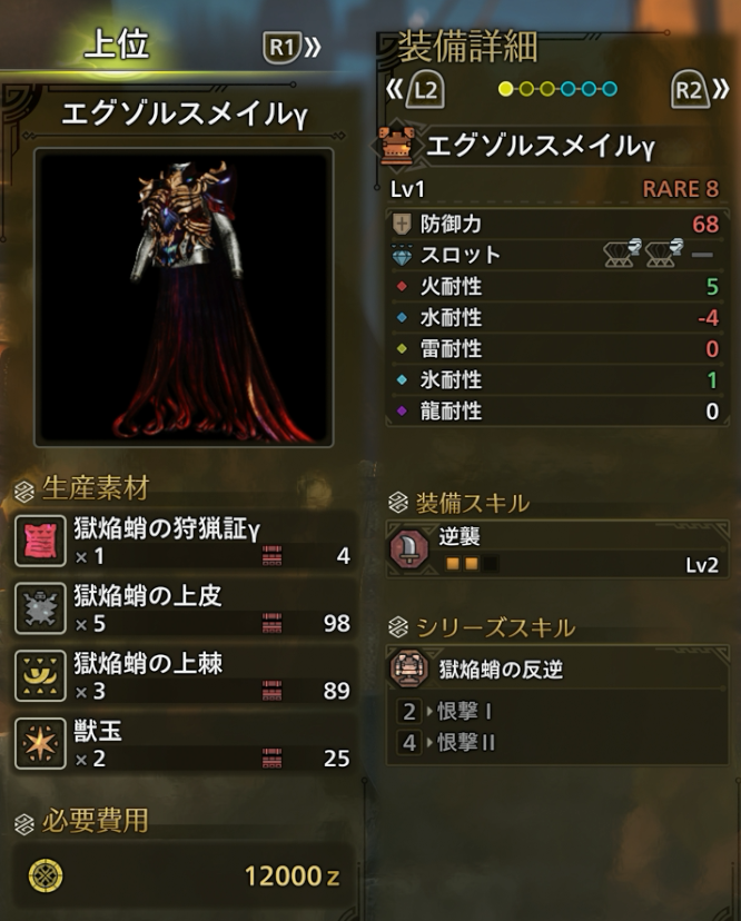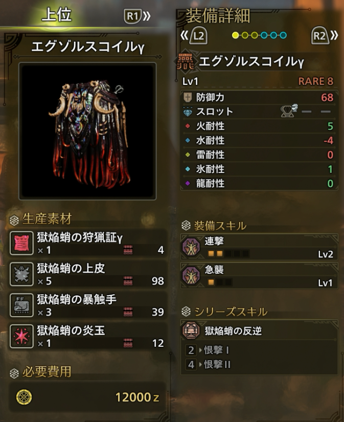 エグゾルスγシリーズは火耐性が5ある点が非常に優秀です。現状最強モンスターである零式オメガ戦では火耐性値が重要となりますが、火耐性が高くてスキル・スロットが優秀な防具が少ない状態でした。