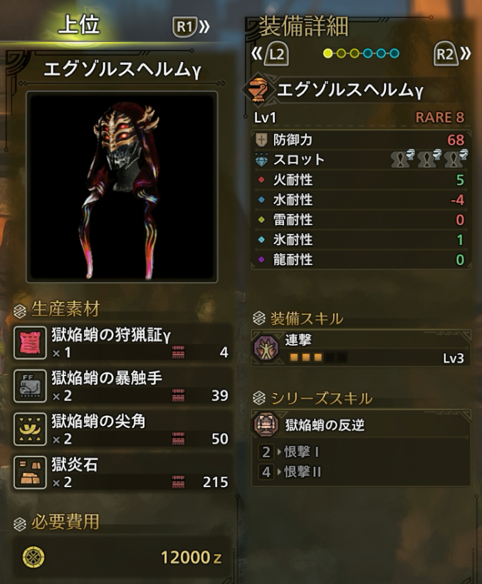 特に頭ですね。連撃Lv3に加えて1スロ×3と装備のインフレを感じます。