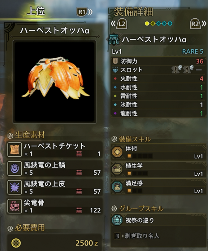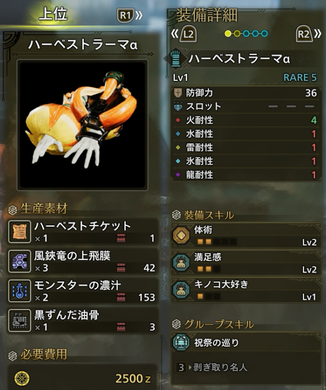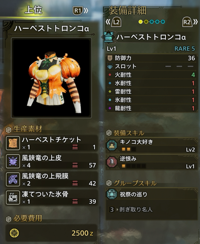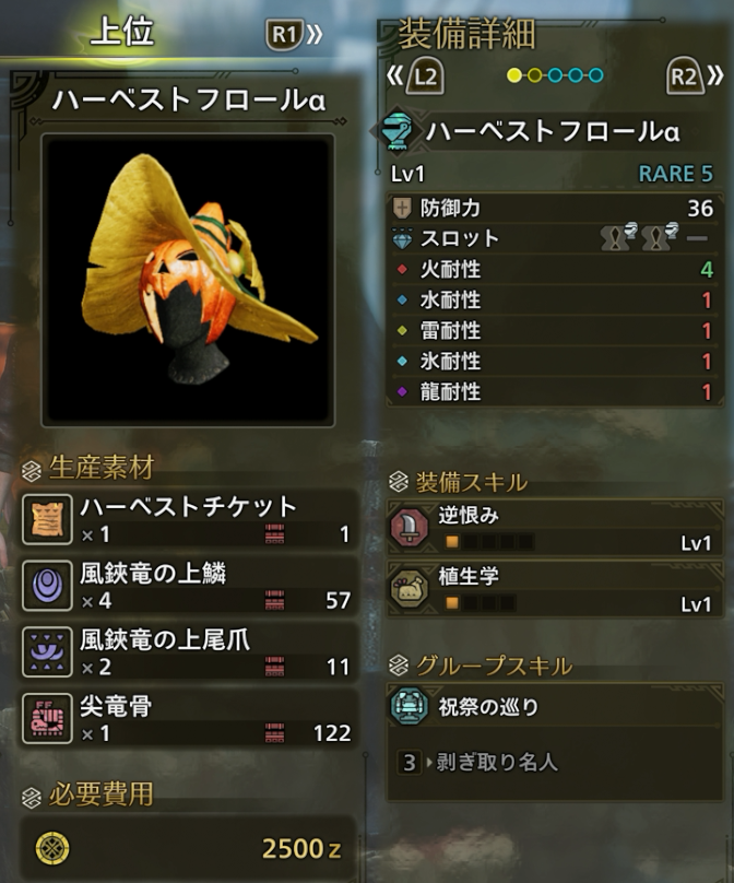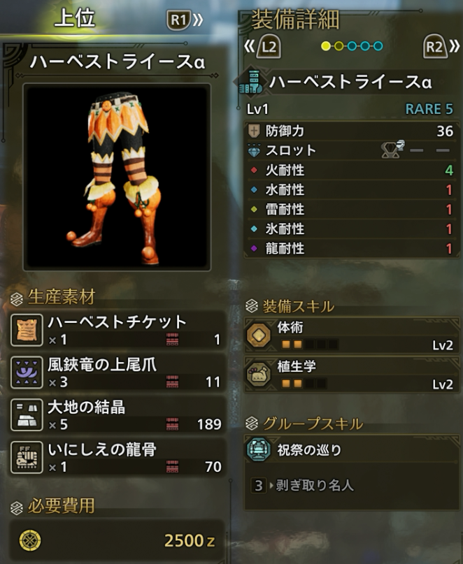 装備としては強いわけではありませんが、重ね着性能は高めなので、一通り生産分は周回しましょう。