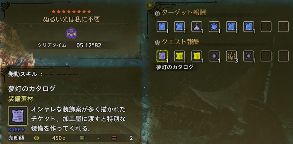 クエストクリアで「夢灯のカタログ」が入手できます。後述しますが全部で6枚必要です。