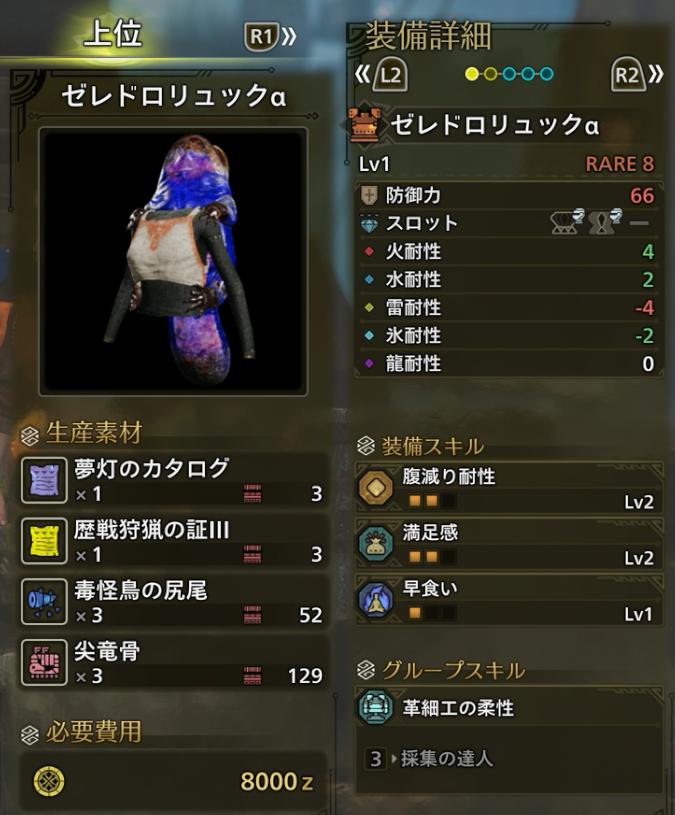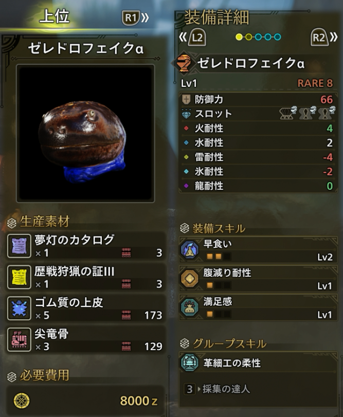 ゼレドロフェイク・ゼレドロリュックは早食い&満足感が付いているので拠点バフ用装備として使えるかもしれませんが、すでに組んでいる人が多いと思いますので、組みなおすほどではないでしょう。