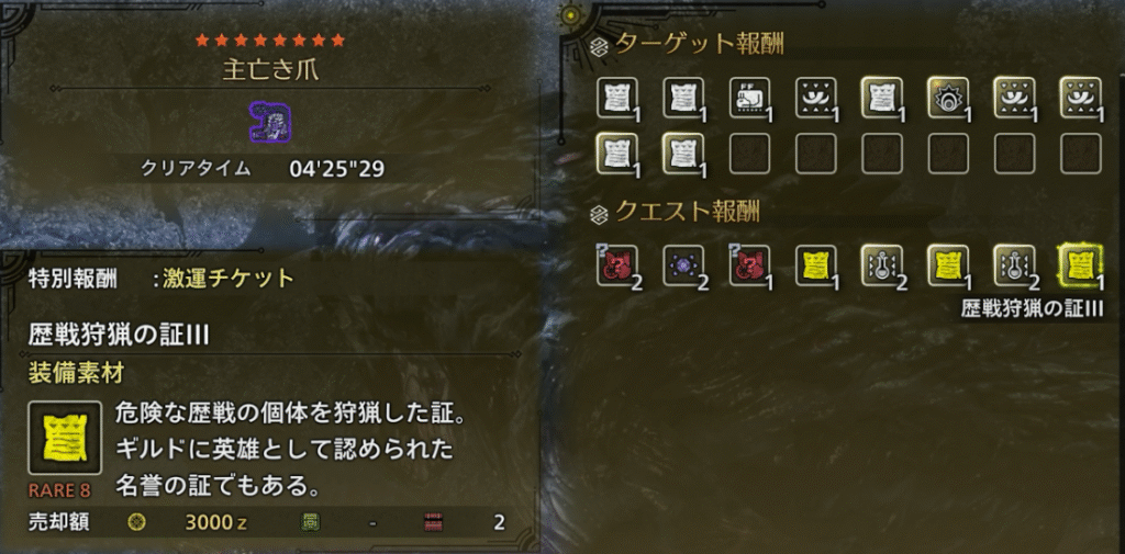 このイベクエのメイン報酬は古びた武器片ですが、★8個体に設定されているので重鎧玉や歴戦狩猟の証Ⅲが入手できます。