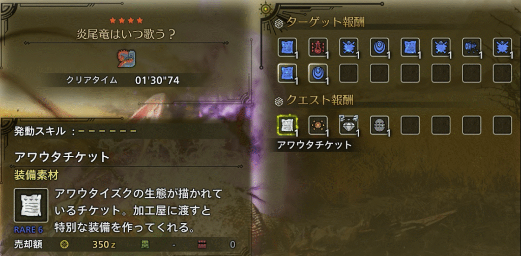 クエストクリアで「アワウタチケット」が入手できます。装備生産には3枚必要です。
