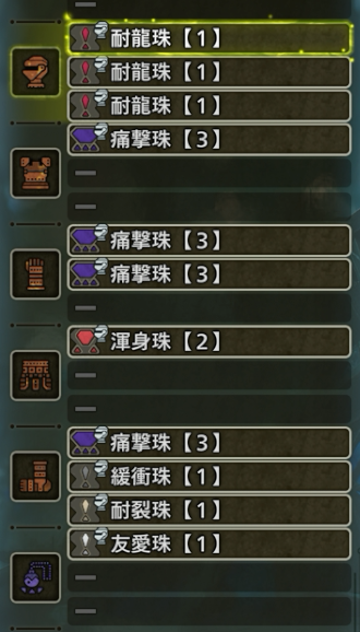 | 護石 | フォースショットLv3 裂傷耐性Lv2 毒耐性Lv1←いらない | ① |