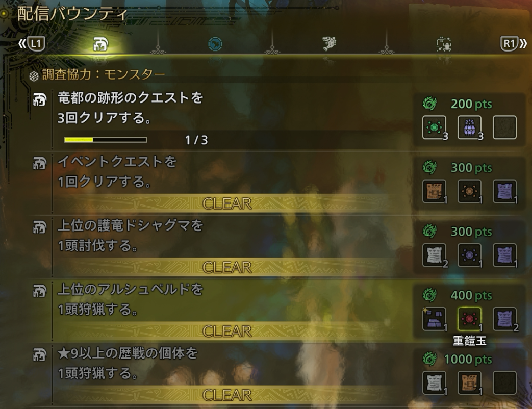 通常、週に1度までの入手制限がありますが、「交わりの祭事」期間中は配信バウンティが毎日更新となるので、重鎧玉を稼ぐチャンスとなります。