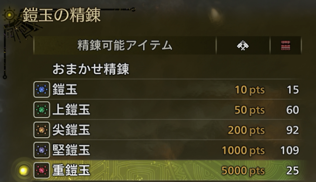 重鎧玉の精錬には素材ポイントを5,000要求されます。